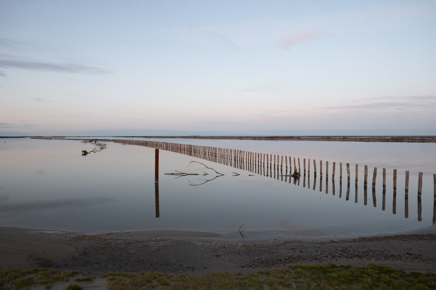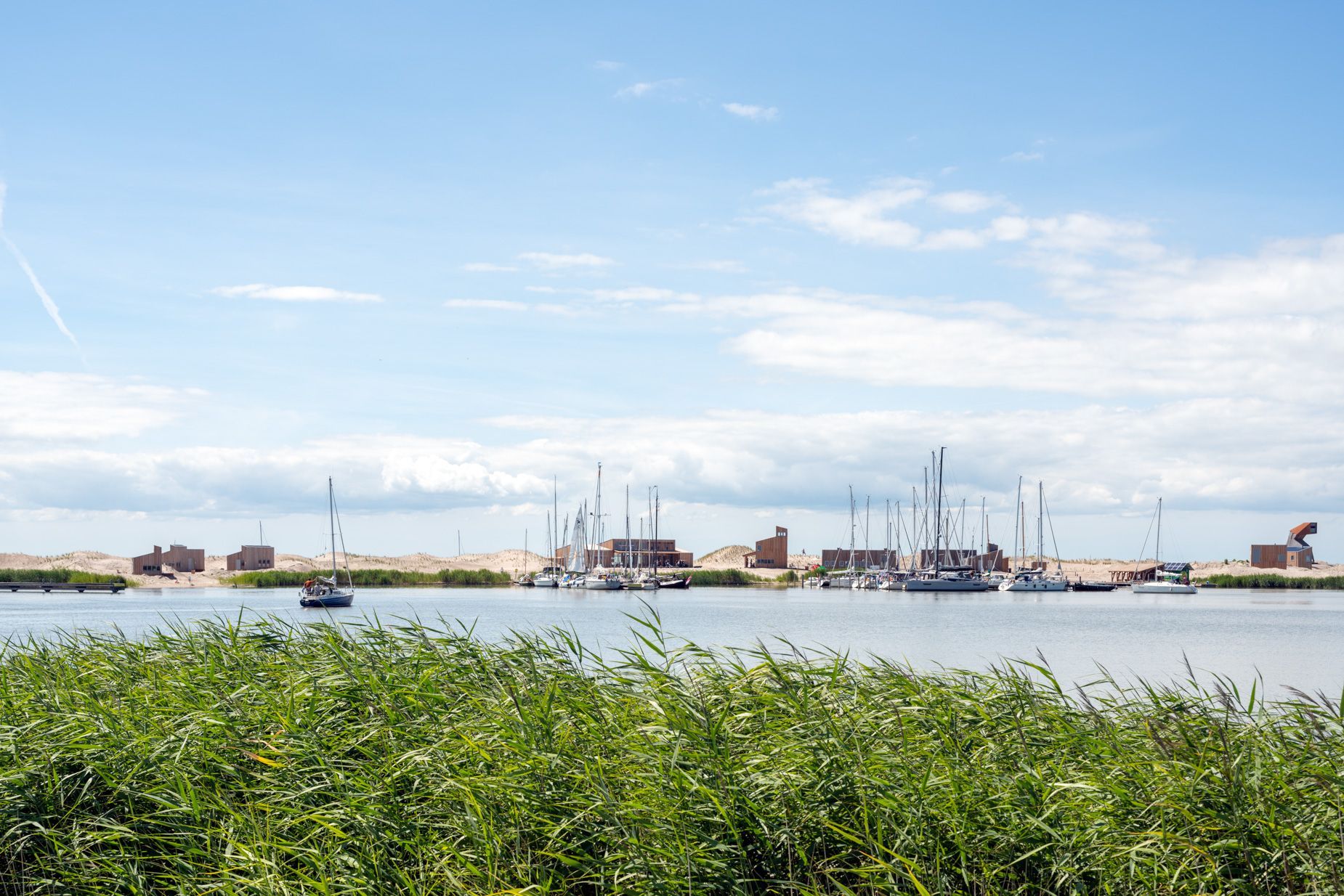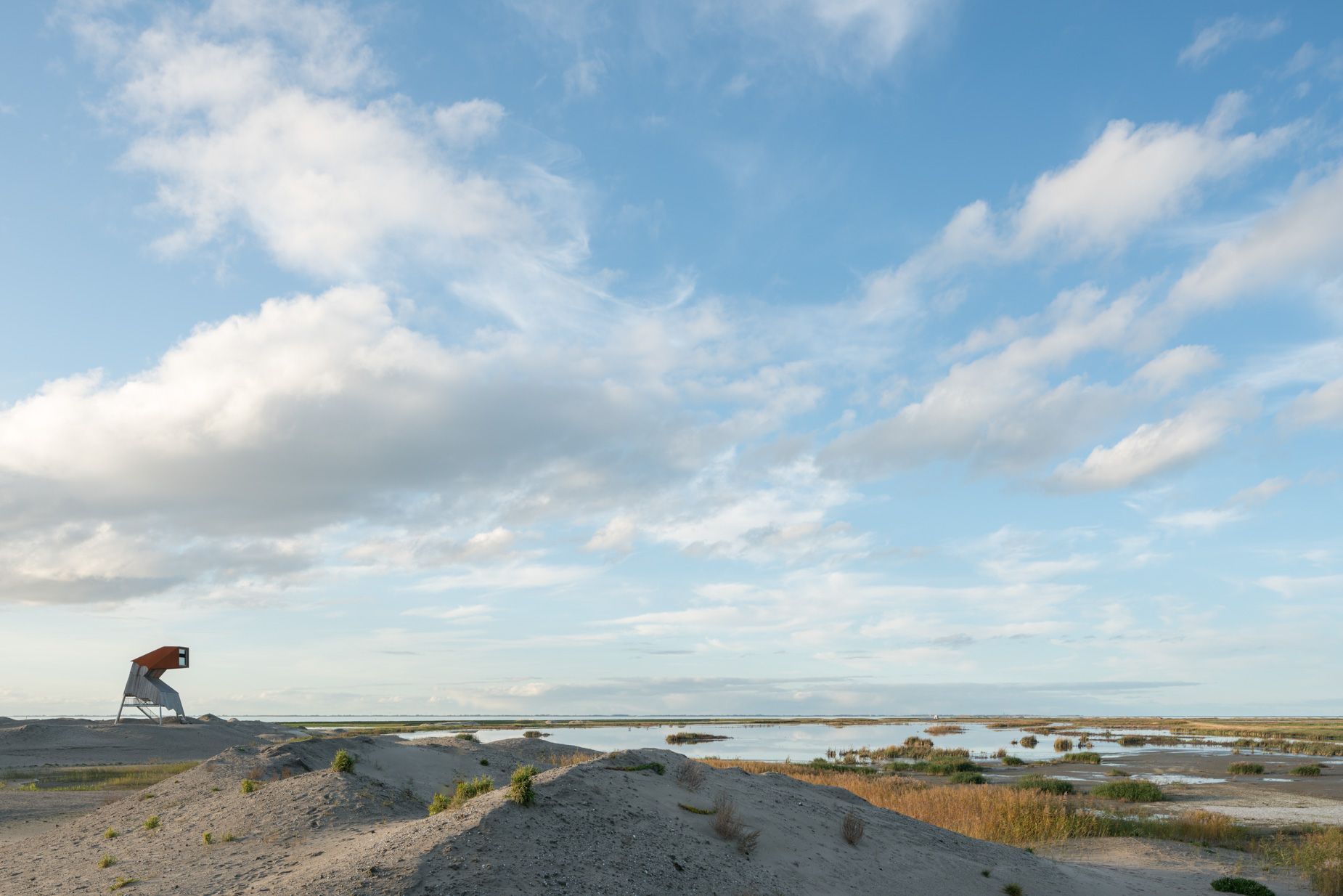 | Ik fotografeer graag een nieuwbouwwijk na de oplevering wanneer de eerste bewoners hun nieuwe biotoop veroveren. Alles is fris en fruitig maar als het waait stuift het bouwzand nog in je ogen: de ontwerpers en bouwers hebben hun hielen gelicht maar de blauwdruk is nog voelbaar. Dat is ook de fase geweest waarin ik tussen 2019 en 2023 gefotografeerd heb op Marker Wadden. Het is nu, niet lang na de oplevering, nog mogelijk om onder de motorkap te kijken. Niet overal zijn de sporen van de landmakers uitgewist door de natuur. De kleur van de boomsoort waarmee de gebouwen zijn opgetrokken is hier en daar nog zichtbaar voordat het door het zonlicht vergrijst. Net als de piketpaaltjes en de sporen van de machines die een handje hielpen bij het natuurmaken. De natuur mag zijn gang gaan maar wel binnen vastgestelde parameters.