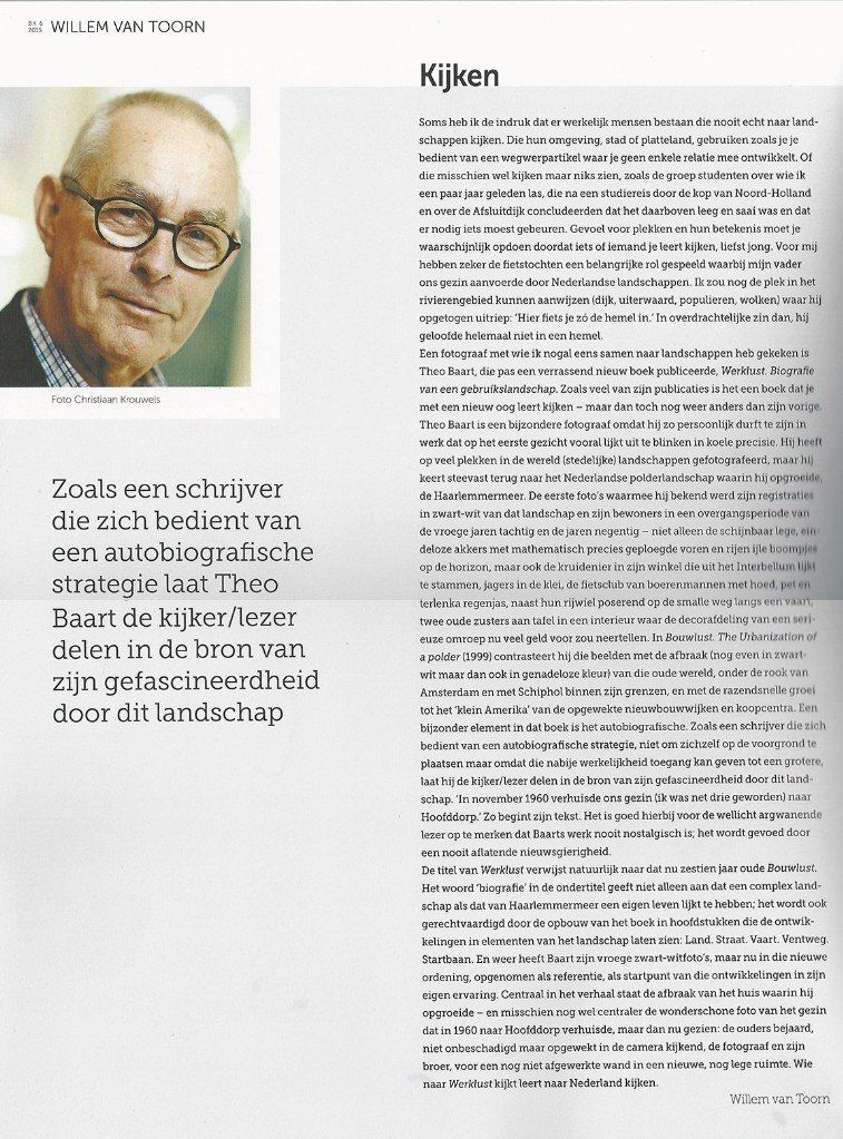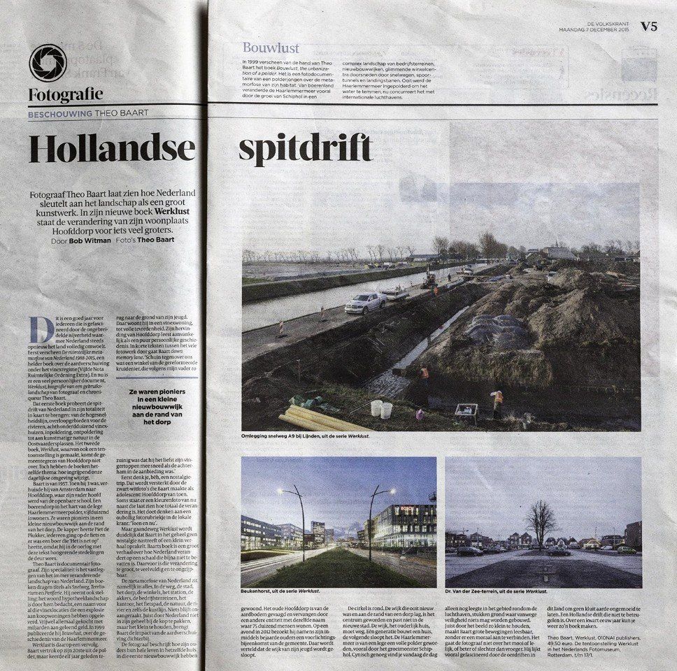 Werklust, biografie van een gebruikslandschap is, afhankelijk van je standpunt, een fascinerend en huiveringwekkend verhaal in beeld en woord van fotograaf Theo Baart over het meest Amerikaanse stuk van Nederland: de Haarlemmermeer.